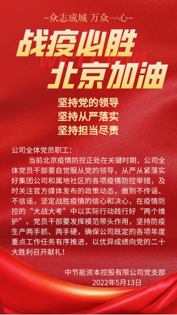 面對北京市近期疫情防控的嚴(yán)峻形勢,中節(jié)能資本黨支部發(fā)揮戰(zhàn)斗堡壘作用,堅持以習(xí)近平新時代中國特色社會主義思想為指導(dǎo),統(tǒng)籌抓好疫情防控、生產(chǎn)經(jīng)營、黨的建設(shè)等各方面工作,奮力奪取疫情防控和改革發(fā)展“雙勝利”。