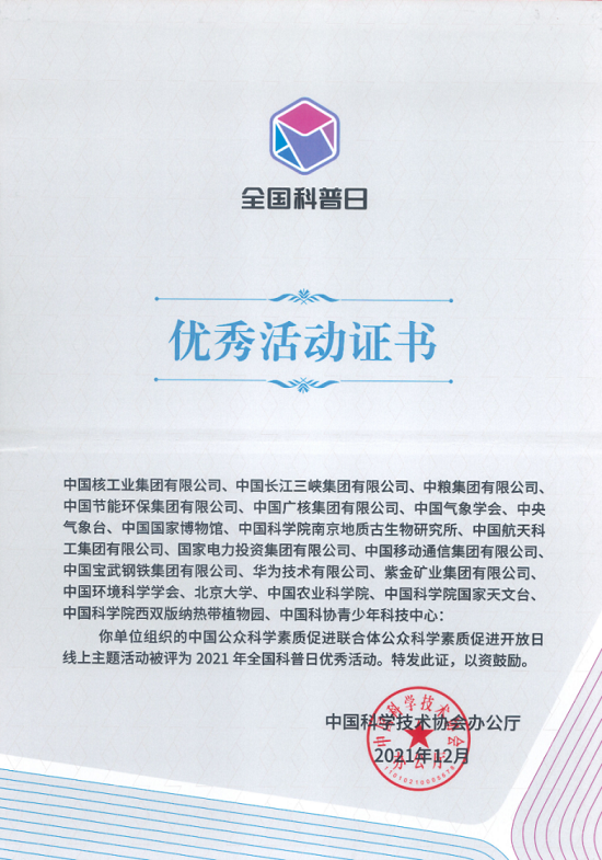 近日,本次科普宣傳活動獲評中國科協(xié)“2021年全國科普日優(yōu)秀活動”。