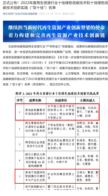 2022年12月29日,再生資源產業(yè)技術創(chuàng)新戰(zhàn)略聯(lián)盟正式公布了2022年度再生資源行業(yè)十佳綠色低碳技術和十佳綠色低碳技術創(chuàng)新實踐(“雙十佳”)名單。經評選認定、公示等程序,中研院牽頭完成的“廢電路板富氧頂吹熔池熔煉技術”、參與完成的“廢電子電器綠色智能循環(huán)關鍵技術與產業(yè)化應用”共兩項技術榮獲2022年度再生資源行業(yè)十佳綠色低碳技術創(chuàng)新實踐成果獎。
