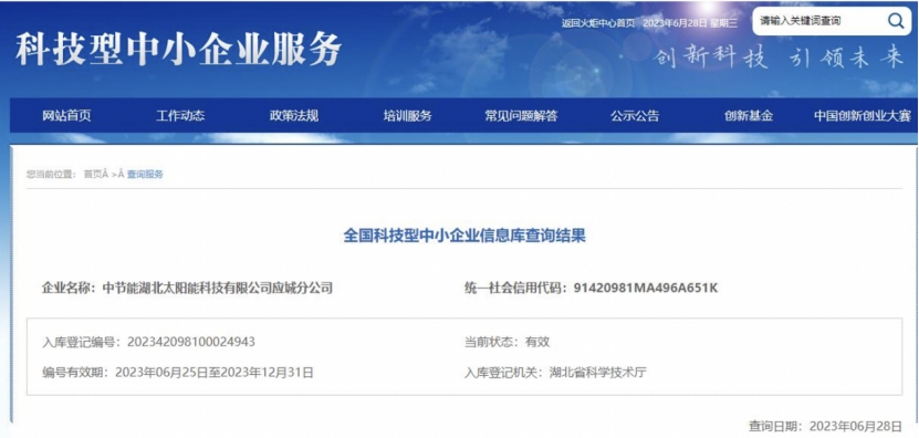 近日,湖北省科學(xué)技術(shù)廳公布湖北省2023年第七批入庫(kù)科技型中小企業(yè)名單,太陽(yáng)能華中區(qū)下屬應(yīng)城分公司成功入庫(kù)國(guó)家科技型中小企業(yè)。