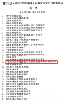 近日,第21屆(2021-2022年度)青海省青年文明號集體評選結(jié)果揭曉,共青團青海東方華路新能源投資有限公司支部委員會被授予青海省青年文明號殊榮。