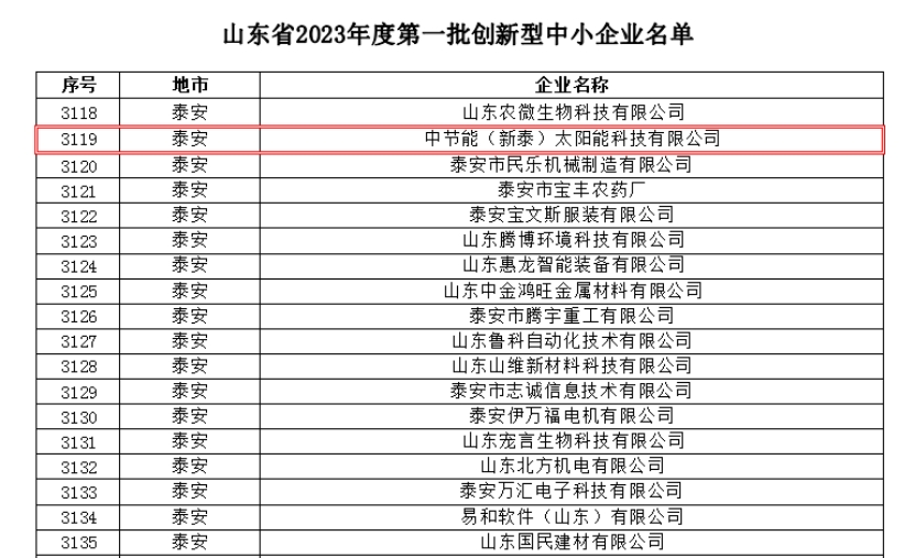 中節(jié)能(新泰)太陽能科技有限公司入選山東省2023年度第一批創(chuàng)新型中小企業(yè) |