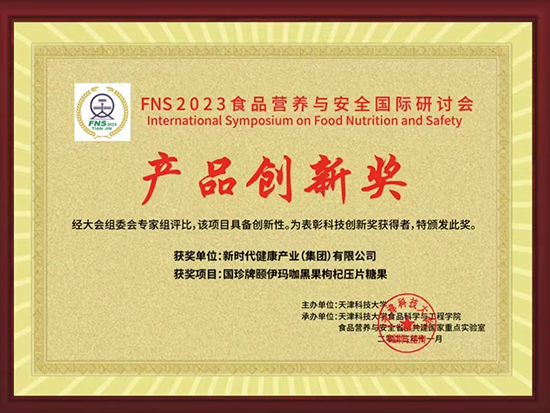 11月17日至19日,由天津科技大學(xué)、天津市食品學(xué)會(huì)主辦的FNS2023食品營養(yǎng)與安全國際研討會(huì)在天津召開。大會(huì)為鼓勵(lì)企業(yè)技術(shù)創(chuàng)新與產(chǎn)品創(chuàng)新,向全國征集科技創(chuàng)新新技術(shù)、新產(chǎn)品、新裝備等并評(píng)選獎(jiǎng)項(xiàng)。健康產(chǎn)業(yè)公司國珍牌頤伊瑪咖黑果枸杞壓片糖果經(jīng)層層篩選,在激烈角逐中勝出,榮獲大會(huì)產(chǎn)品創(chuàng)新獎(jiǎng)。