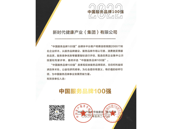 新時(shí)代集團(tuán)下屬健康產(chǎn)業(yè)公司喜獲“中國服務(wù)品牌100強(qiáng)”殊榮 |