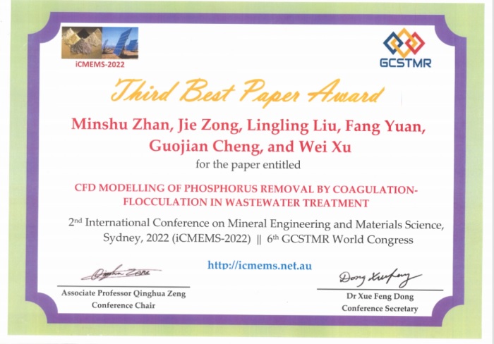 近日,基于公司牽頭承擔(dān)的集團(tuán)公司2019年度重大科技創(chuàng)新項(xiàng)目《污水處理新型藥劑開發(fā)及投加量?jī)?yōu)化控制研究與示范》的“除磷藥劑智能投加系統(tǒng)”技術(shù)成果完成的《CFD Modelling of Phosphorus Removal by Coagulation-Flocculation in Wastewater Treatment 》論文在第2屆礦物工程與材料科學(xué)國際會(huì)議(The 2nd International Conference on Mineral Engineering and Materials Science, 簡(jiǎn)稱iCMEMS-2022)上獲評(píng)優(yōu)秀論文(三等獎(jiǎng))。