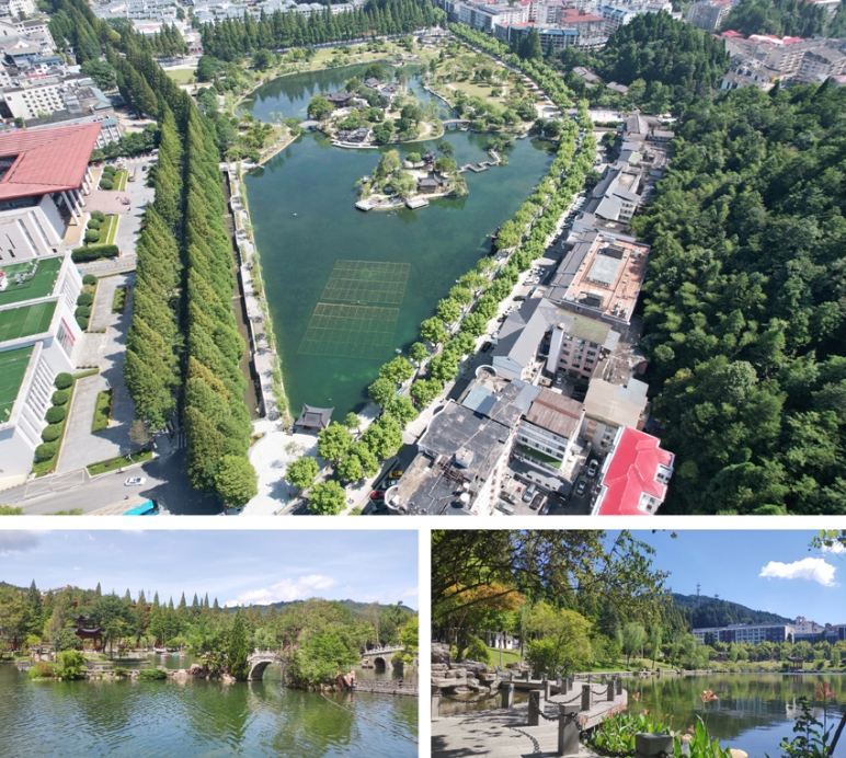 挹翠湖公園位于井岡山風景名勝區(qū)茨坪中心景區(qū)核心位置,被中心大道、紅軍路、南山路三條主路圍合。中節(jié)能鐵漢通過對挹翠湖公園景觀提升,形成山水相生、城景相滲、游客共享生態(tài)特色的核心綠色空間,推動紅色景區(qū)與生態(tài)公園滲透融合,為當?shù)鼐用窈陀慰蜖I造四季皆有景可賞的精致山水畫卷。