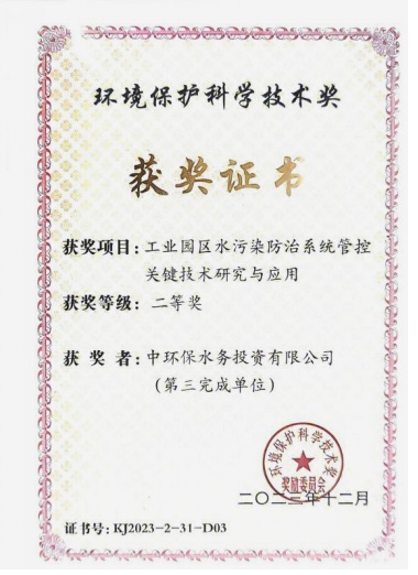近日,國家生態(tài)環(huán)境部、環(huán)境保護科學技術(shù)獎勵委員會向中環(huán)保水務(wù)投資有限公司頒發(fā)了“2023年環(huán)境保護科學技術(shù)獎獲獎證書”。作為“工業(yè)園區(qū)水污染防治系統(tǒng)管控關(guān)鍵技術(shù)研究與應(yīng)用”項目第三完成單位,中環(huán)水務(wù)榮獲二等獎。