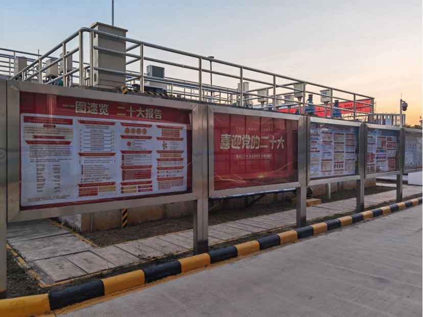 中環(huán)水務(wù)黨委堅(jiān)持學(xué)習(xí)宣傳一體推進(jìn)、相互促進(jìn)。中環(huán)水務(wù)官網(wǎng)、官微、小程序、企業(yè)內(nèi)刊四位一體、綜合發(fā)力。精心策劃二十大宣傳專題、專欄和??O聦偎煜军h支部在城月總廠區(qū)張貼二十大精神系列海報(bào),其他11個(gè)廠區(qū)通過拉橫幅、張貼二十大精神要點(diǎn)等形式將黨的二十大精神宣傳到基層。溫州中環(huán)黨支部制作專題宣傳欄,并通過LED電子顯示屏、QQ群、微信群、生產(chǎn)會(huì)議等載體,大力宣傳二十大精神,做到二十大金句人盡皆知,營(yíng)造了濃厚的宣傳氛圍。蚌埠中環(huán)黨委利用機(jī)關(guān)大院3塊LED屏循環(huán)滾動(dòng)宣傳二十大精神,并在大樓門廳處制作、展示黨的二十大報(bào)告解讀宣傳板報(bào)。