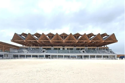 馬術(shù)場(chǎng)館屋頂由73000余個(gè)、直徑20毫米的膠合木螺栓鎖住。單榀(雙拼)木梁最大長(zhǎng)度達(dá)96米,木梁跨度66米,最大懸挑20米,系國(guó)內(nèi)最大跨度的木結(jié)構(gòu)體育建筑。