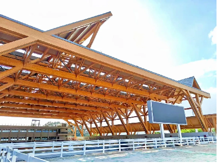 項(xiàng)目整體采用“鋼木結(jié)合”形式,兩側(cè)由鋼立柱作為支撐,屋架由鋼木桁架組成,屋面以金屬屋面板覆蓋,木結(jié)構(gòu)材料選用層板膠合木-花旗松規(guī)格材,為新型特殊木質(zhì)材料。