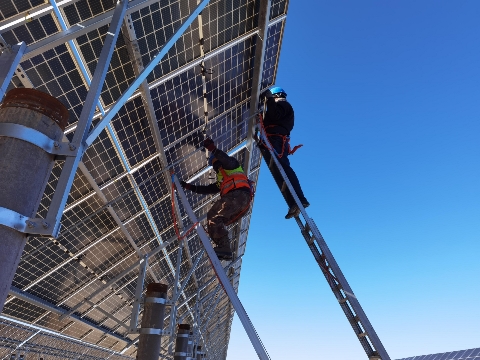 太陽能華北區(qū)通榆電站自入秋以來,突如其來的三場臺風(fēng)給設(shè)備安全穩(wěn)定運(yùn)行帶來嚴(yán)峻考驗(yàn)。廠區(qū)積水嚴(yán)重,多處道路變成深水區(qū),給設(shè)備安全穩(wěn)定運(yùn)行帶來極大隱患,且地面積水無法架設(shè)絕緣梯,給運(yùn)維人員檢修發(fā)電設(shè)備制造了嚴(yán)重障礙,檢修設(shè)備難度大大增加,但電站運(yùn)維人員不等不靠,紛紛化身“智多星”,群策群力,出謀劃策,最后決定在絕緣梯頂端加裝掛鉤,再用頂端的掛鉤懸掛在光伏支架上進(jìn)行維護(hù),解決運(yùn)維難題。 埋頭苦干戰(zhàn)嚴(yán)寒,提質(zhì)增效保發(fā)電