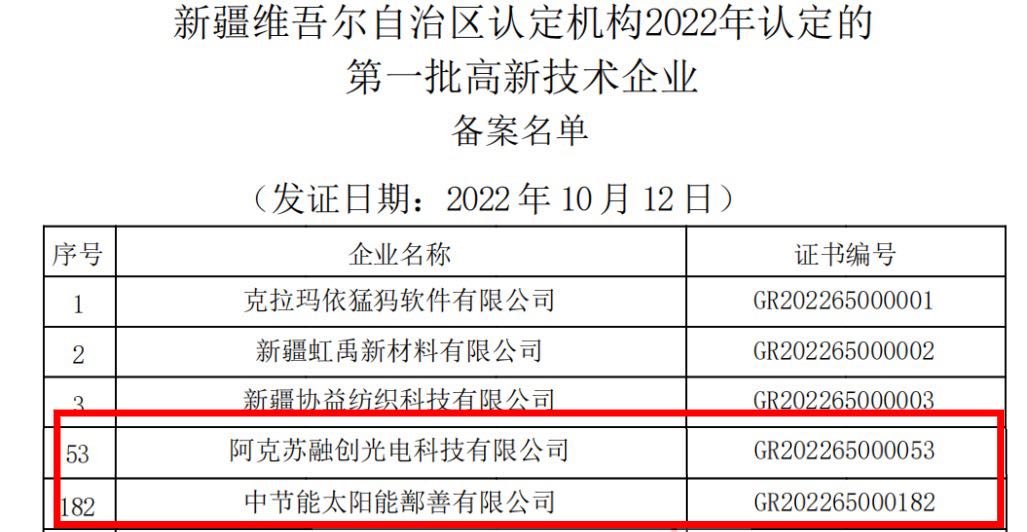 近日,全國高新技術(shù)企業(yè)認(rèn)定管理工作領(lǐng)導(dǎo)小組辦公室發(fā)布了《新疆維吾爾自治區(qū)認(rèn)定機(jī)構(gòu)2022年認(rèn)定的第一批303家高新技術(shù)企業(yè)備案名單》,太陽能新疆區(qū)下屬中節(jié)能太陽能鄯善有限公司、阿克蘇融創(chuàng)光電科技有限公司2家公司被認(rèn)定為2022年第一批國家高新技術(shù)企業(yè)。