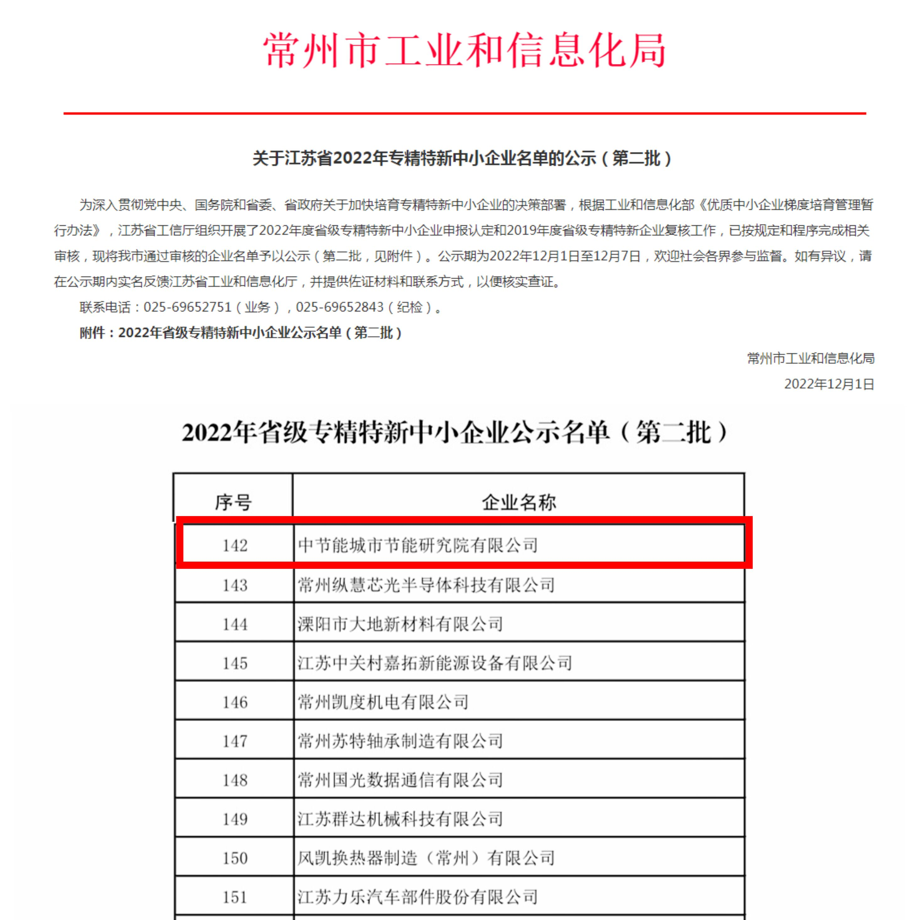 12月1日,江蘇省工信廳完成2022年度省級專精特新中小企業(yè)認(rèn)定,中節(jié)能城市節(jié)能研究院有限公司成功入選“2022年江蘇省專精特新中小企業(yè)”。