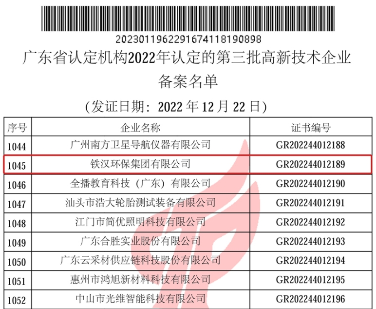 日前,中節(jié)能鐵漢環(huán)保集團(tuán)有限公司(以下簡稱鐵漢環(huán)保)收到全國高新技術(shù)企業(yè)認(rèn)定管理工作領(lǐng)導(dǎo)小組辦公室發(fā)布的《關(guān)于對(duì)廣東省認(rèn)定機(jī)構(gòu)2022年認(rèn)定的第三批高新技術(shù)企業(yè)進(jìn)行備案的公告》,根據(jù)《廣東省認(rèn)定機(jī)構(gòu)2022年認(rèn)定的第三批高新技術(shù)企業(yè)備案名單》,鐵漢環(huán)保已通過高新技術(shù)企業(yè)認(rèn)定。這是自2016年起,鐵漢環(huán)保連續(xù)第三次通過國家高新技術(shù)企業(yè)認(rèn)定。