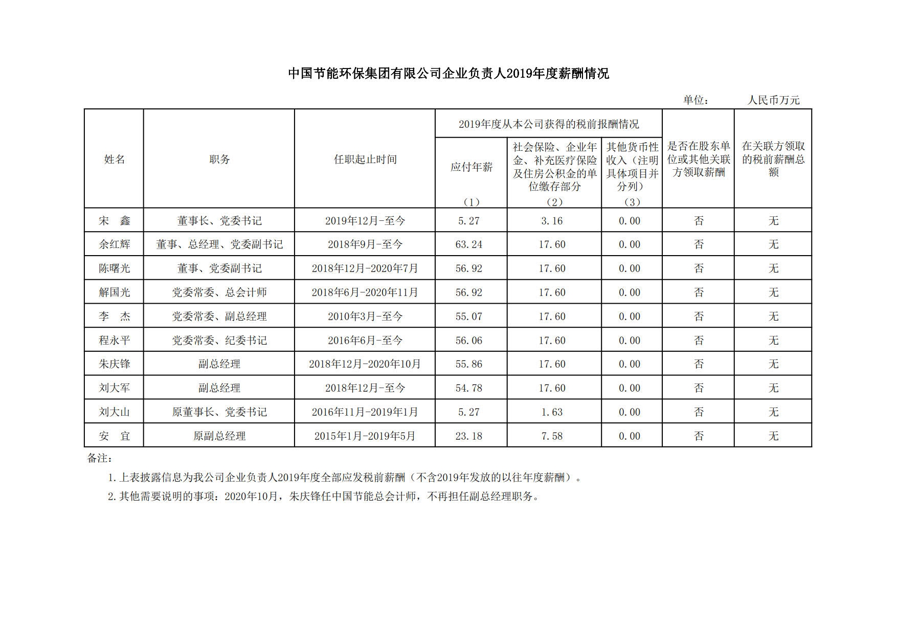 中國節(jié)能環(huán)保集團公司企業(yè)負責人2019年度薪酬情況